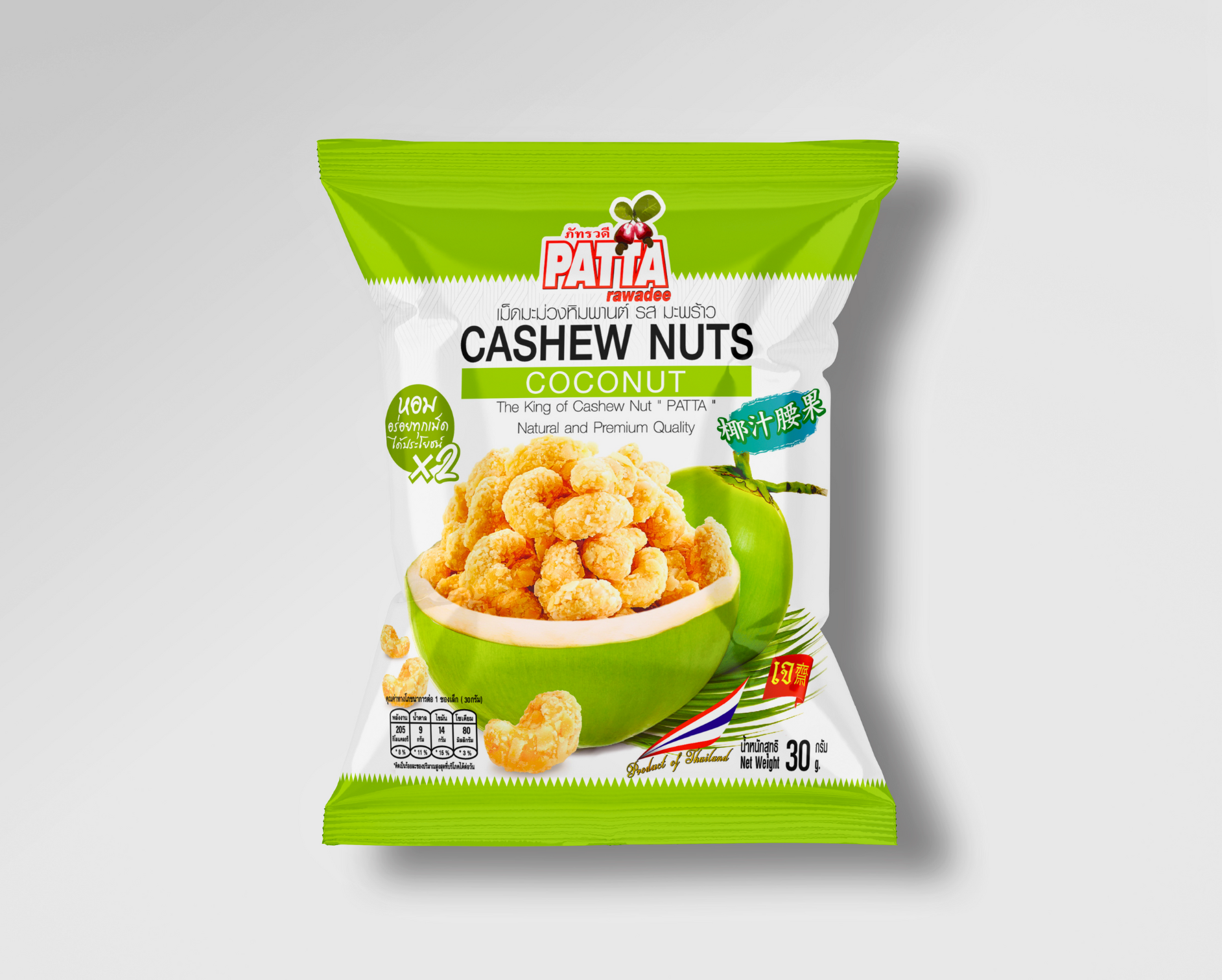 ผลิตภัณท์ที่ออกแบบบรรจุภัณฑ์เป็นถุงมินิมอล ขนาดพกพา สะดวกในการรับประทาน คงความกรอบของเม็ดมะม่วงหิมพานต์ พร้อมสัมผัสถึงความหอมหวานแบบธรรมชาติ ของเนื้อมะพร้าว
